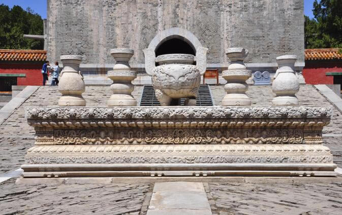 明楼介绍:明楼是定陵的标志性建筑,上面匾额书"定陵"二字,楼内竖"圣号碑",碑额篆刻"大明"二字,碑身刻"神宗显皇帝之陵",神宗是庙号,显是谥号。 在十三陵中保存完整的明楼有三座,定陵就是其中之一,这是因为定陵明楼全部以石料雕刻组装而成,通体上下无片木寸钉,故而存立世间400余年,仍巍峨壮观,完好无损,成为我国古代建筑艺术和石雕艺术高超技艺的明证。 |