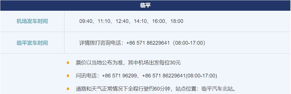 临安线:机场候机楼到达厅8号门 → 临安客运中心 11:10, 13:00, 17:30, 19:10