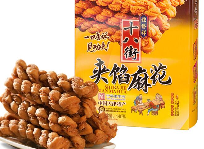 桂发祥麻花的创始人是范贵才、范贵林兄弟,他们曾在天津大沽南路的十八街各开了“桂发祥”和“桂发成”麻花店,因店铺座落于十八街,人们又习惯称其为十八街麻花。十八街麻花是经过反复探索进行创新,在白条和麻条中间夹一条含有桂花、闵姜、桃仁、瓜条等多种小料的酥馅,使炸出的麻花酥软香甜与众不同,创造出的什锦夹馅大麻花。其特点是香、酥、脆、甜,在干燥通风处放置数月不走味,不绵软、不变质。来天津旅游的国内外宾客,临走时都要带上几盒麻花,送亲朋好友。