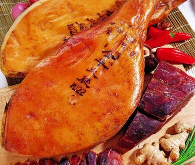 产品名称:金华火腿产品产地:浙江金华产品特性: 色、香、味、形“四绝产品简介:由于所用原料和加工季节以及腌制方法的不同,金华火腿又有许多不同的品种。如在隆冬季节腌制的,叫正冬腿;将腿修成月牙形的,叫月腿;用前腿加工,呈长方形的,称风腿;挂在锅灶间,经常受到竹叶烟熏烤的,称熏腿;用白糖腌制的,叫糖腿;还有与狗腿一起腌制的,称戌腿。产品历史:据传南宋抗金名将宗泽(义乌人)是火腿业的祖师爷;有的传说讲他把家乡猪肉经过腌制带至皇宫,进献给皇上,皇帝见到剖开的腿肉绯红似火,即把它命名为“金华火腿”。